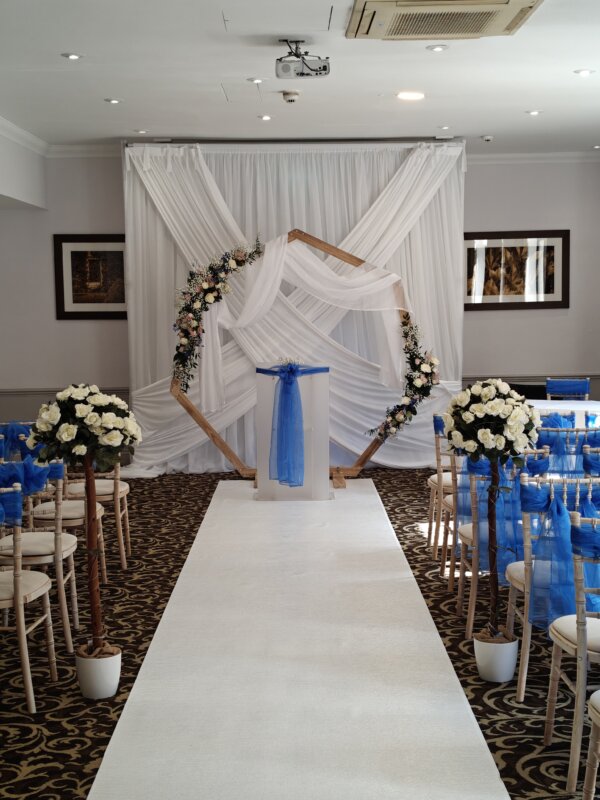 Create a stunning focal point with our Heptagonal Wedding Arch. This elegant wooden heptagon is supplied with a white drape cloth to hang over the frame and makes a beautiful ceremony arch, top table backdrop or decorative feature at receptions.