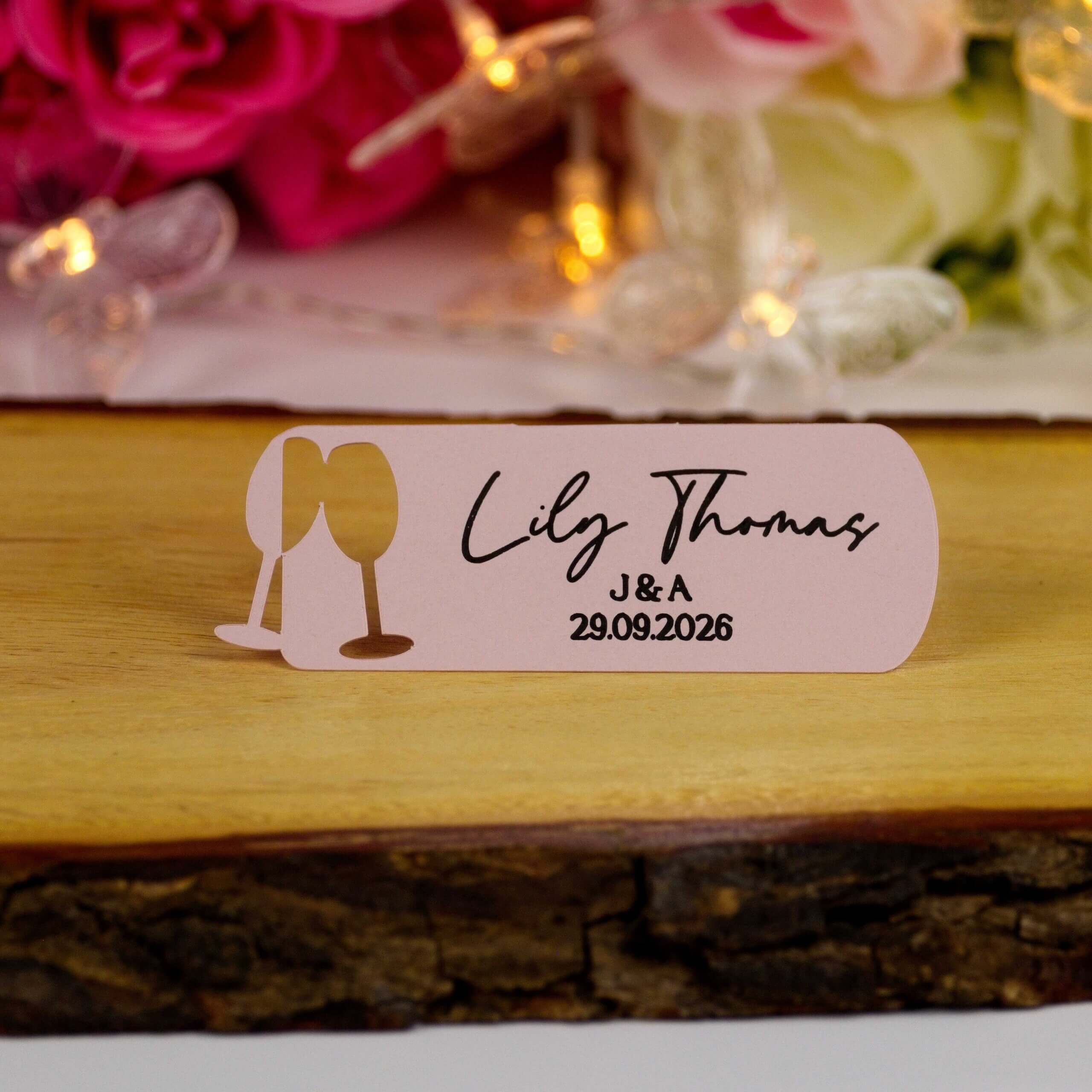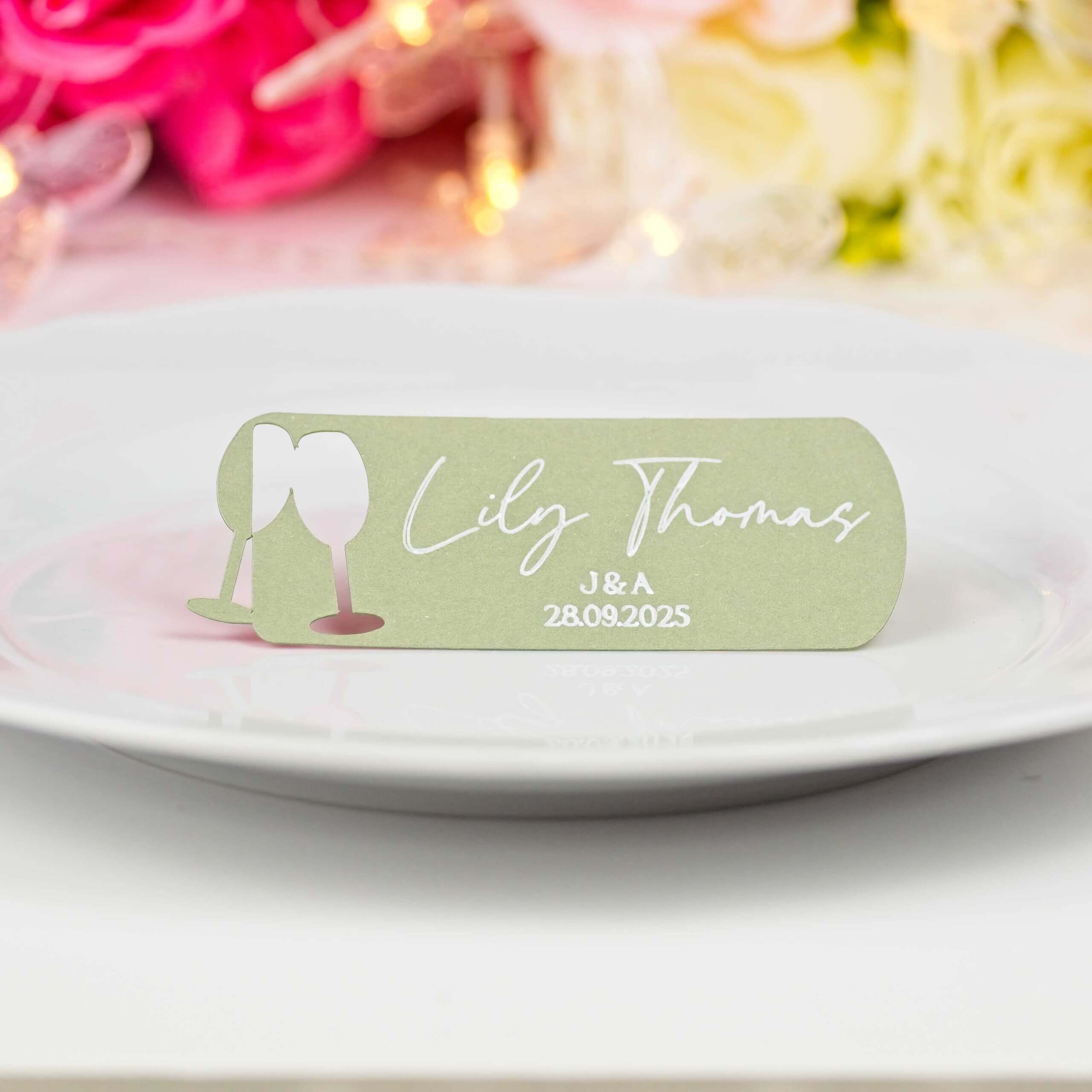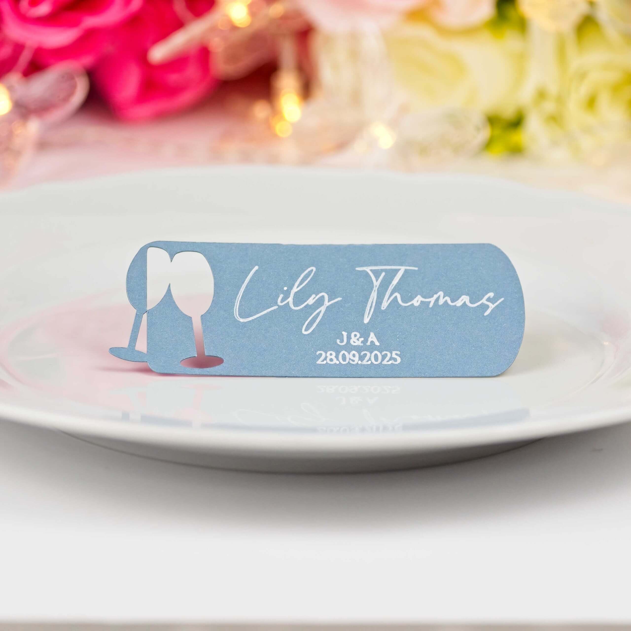 Add a sparkling, personalised touch to your wedding tables — champagne glass cut-out, machine-written guest names with a handwritten look, and the couple’s initials + date on every card. Perfect for wedding receptions, engagement parties or bridal showers and a lovely keepsake for guests.