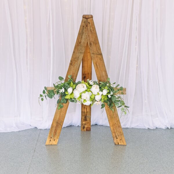 Bring a warm, rustic touch to your event with our Rustic Easel. Crafted from pallet‑style wood with a deliberately rough finish, the easel is finished with mounted eucalyptus and white flower heads for a soft, natural accent — perfect for displaying a welcome sign or seating plan.